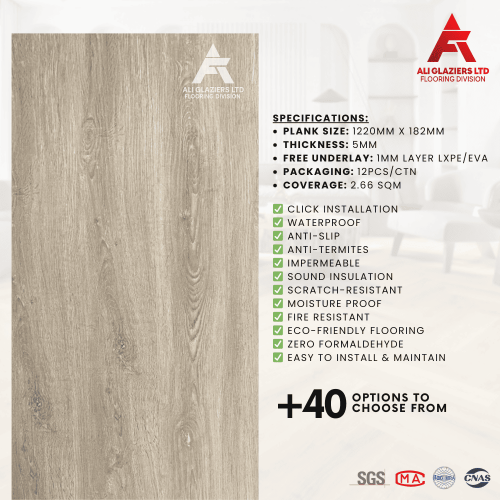 SPC flooring stands for Stone Plastic Composite flooring. It consists of a robust core layer made from a blend of natural limestone powder, polyvinyl chloride, and stabilizers. This unique composition gives SPC flooring its impressive durability and water resistance. Come visit Ali Glaziers Ltd to check out a wide range of high quality flooring solutions ranging from laminated flooring, PVC flooring, SPC flooring, artificial turf grass, vinyl (mkeka) flooring and so much more while also having a wide range of skirtings, reducers & other installation materials – shop one-stop at the best prices guaranteed for retail & wholesale orders!