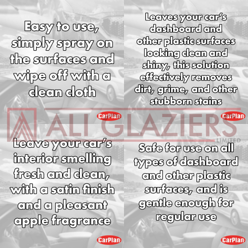 CarPlan Flash Dash effortlessly removes ingrained dirt and grime from dashboards and interior plastic trim. It leaves a rich satin finish recreating a natural new look particularly suitable for modern vehicles. The new improved, silicone-free, water based formula protects against drying, cracking and fading. The foam cleaning technology also protects dashboards against the build up of dirt and grime, to keep surfaces dust free and cleaner for longer. After cleaning, Flash Dash leaves a pleasant air freshening apple fragrance to refresh the vehicle.