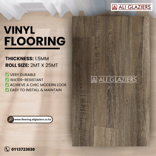Vinyl Flooring is a great, pocket-friendly option alternative to traditional flooring solutions which take alot of time, costs and resources for installation and maintenance. The first thing people see when entering a room without realising it should be something beautiful which brings the whole room together. That's why vinyl flooring is such a great option! With up to 15+ unique designs & shades to choose from, Ali Glaziers Ltd remains your number 1 choice when it comes to affordability, value for money and best service! Visit our showroom to check out one of the widest range of flooring in Kenya at 100% competitive pricing from Kenya's leading flooring suppliers!
