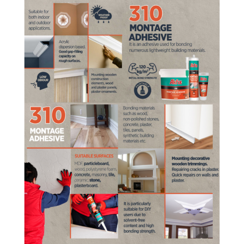 Akfix 310 is a water-based adhesive used for bonding numerous building materials. It is particularly suitable for DIY users due to solvent-free content and high bonding strength. High performance with 120 kg/m2. Perfect, acrylic based, solvent-free adhesive used for mounting light construction material with different surface structures.