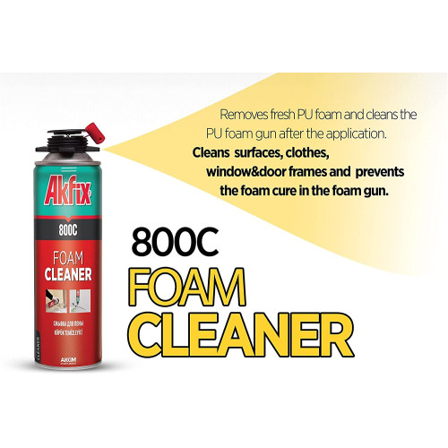 Akfix 800C removes fresh PU foam and cleans the PU foam gun adapter after the application. Cleans surfaces, clothes, window&door frames and prevents the foam cure in the gun adapter.