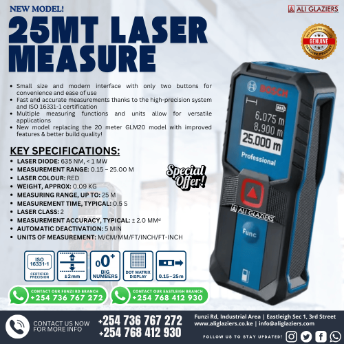 A laser measure is an easier, faster and more accurate way to measure which delivers accurate results with the laser precision technology and real-time measurement mode, taking instant and reliable measurements up to 25 meters, so one person can size up the job in seconds. Square and compact by design, the laser measure is ready for anywhere portability. Visit Ali Glaziers Ltd today to check out a wide range of quality measuring tools at the best prices in Kenya!