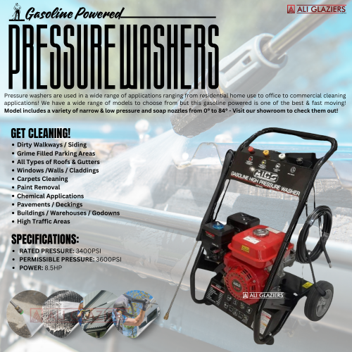 Pressure washers are used in a wide range of applications ranging from residential home use to office to commercial cleaning applications! We have a wide range of models to choose from but this gasoline powered is one of the best & fast moving! Model includes a variety of narrow & low pressure and soap nozzles from 0° to 84° - Visit our showroom to check them out! SET INCLUDES GUN, PIPE & FILTER!