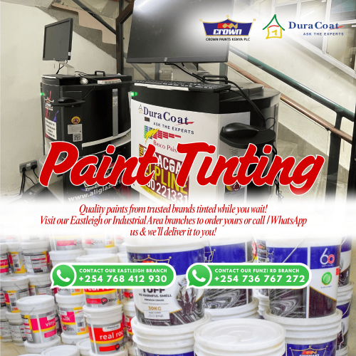 • We have been consistently stocking genuine & trusted brands of paints like CROWN & DURA COAT with a wide range of colours, great coverage and competitive wholesale and retail pricing in Kenya since 1980!