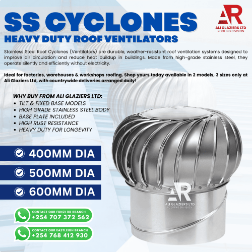 Improve air circulation and reduce heat buildup with our high-performance Roof Ventilators (Cyclones) the perfect choice from Ali Glaziers Ltd, the ideal solution for factories, warehouses, workshops, schools, and residential buildings across Kenya. Made from premium-grade stainless steel, these wind-driven roof ventilators operate silently and efficiently without electricity, making them eco-friendly and cost-effective. They continuously expel hot, stale or contaminated air ensuring a cooler, fresher and healthier indoor environment all year round. Shop now only from Ali Glaziers Ltd in Kenya!